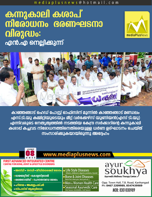 കാഞ്ഞങ്ങാട്: കന്നുകാലി കശാപ് വിജ്ഞാപനം വഴി നിരോധിച്ചുള്ള കേന്ദ്ര തീരുമാനം ഭരണഘടനാ വിരുദ്ധമായ തീരുമാനമെന്ന് എന്.എ നെല്ലിക്കുന്ന് എം.എല്.എ. കാഞ്ഞങ്ങാട് ഹെഡ് പോസ്റ്റ് ഓഫിസിന് മുന്നില് കാഞ്ഞങ്ങാട് മണ്ഡലം എസ്.ടി.യു കമ്മിറ്റിയുടെയും മീറ്റ് വര്ക്കേഴ്സ് യൂണിയന്(എസ് ടി.യു) എന്നിവരുടെ നേതൃത്വത്തില് നടത്തിയ കേന്ദ്ര സര്ക്കാറിന്റെ കന്നുകാലി കശാപ്പ് കച്ചവട നിരോധനത്തിനെതിരെയുള്ള ധര്ണ ഉദ്ഘാടനം ചെയ്ത് സംസാരിക്കുകയായിരുന്നു അദ്ദേഹം,