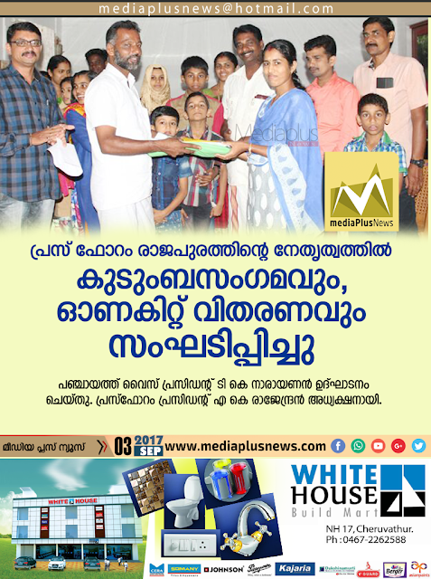 രാജപുരം: പ്രസ് ഫോറം രാജപുരത്തിന്റെ നേതൃത്വത്തില് കുടുംബസംഗമവും, ഓണകിറ്റ് വിതരണവും സംഘടിപ്പിച്ചു. പഞ്ചായത്ത് വൈസ് പ്രസിഡന്റ് ടി കെ നാരായണന് ഉദ്ഘാടനം ചെയ്തു. പ്രസ്ഫോറം പ്രസിഡന്റ് എ കെ രാജേന്ദ്രന് അധ്യക്ഷനായി. ജി ശിവദാസന്, സജി ജോസഫ്, വി പ്രമോദ് എന്നിവര് സംസാരിച്ചു. രവീന്ദ്രന് കൊട്ടോടി സ്വാഗതവും, നൗഷാദ് ചുള്ളിക്കര നന്ദിയും പറഞ്ഞു.