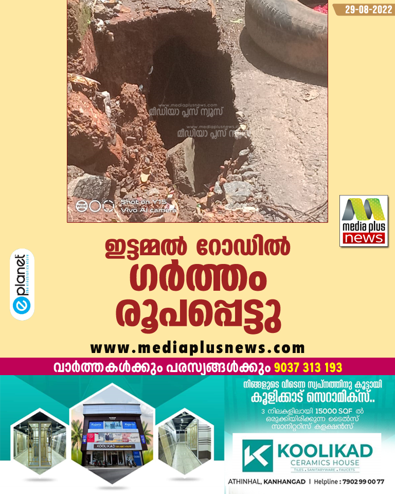 ഇഖ്ബാൽനഗർ വഴി ഇട്ടമ്മലിലെത്തുന്ന റോഡിലാണ് വലിയ കുഴി പ്രത്യക്ഷപ്പെട്ടത്. റോഡിൻ്റെ അടിഭാഗത്തേക്ക് ആഴ്ന്നിറങ്ങുന്നതാണ് ഗർത്തം. ഇതിന് തൊട്ടടുത്ത് റോഡിന് കുറുകെ ഓടയുണ്ട്. റോഡ് ഈ ഭാഗത്ത് മൊത്തത്തിൽ ഇടിഞ്ഞ് വീഴുമോയെന്ന ആശങ്കയിലാണ് യാത്രക്കാർ. ദിവസങ്ങൾ കഴിഞ്ഞിട്ടും അധികൃതർ തിരിഞ്ഞ് നോക്കിയില്ലെന്ന് നാട്ടുകാർ പറയുന്നു.